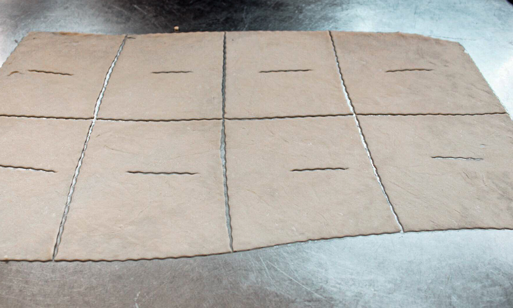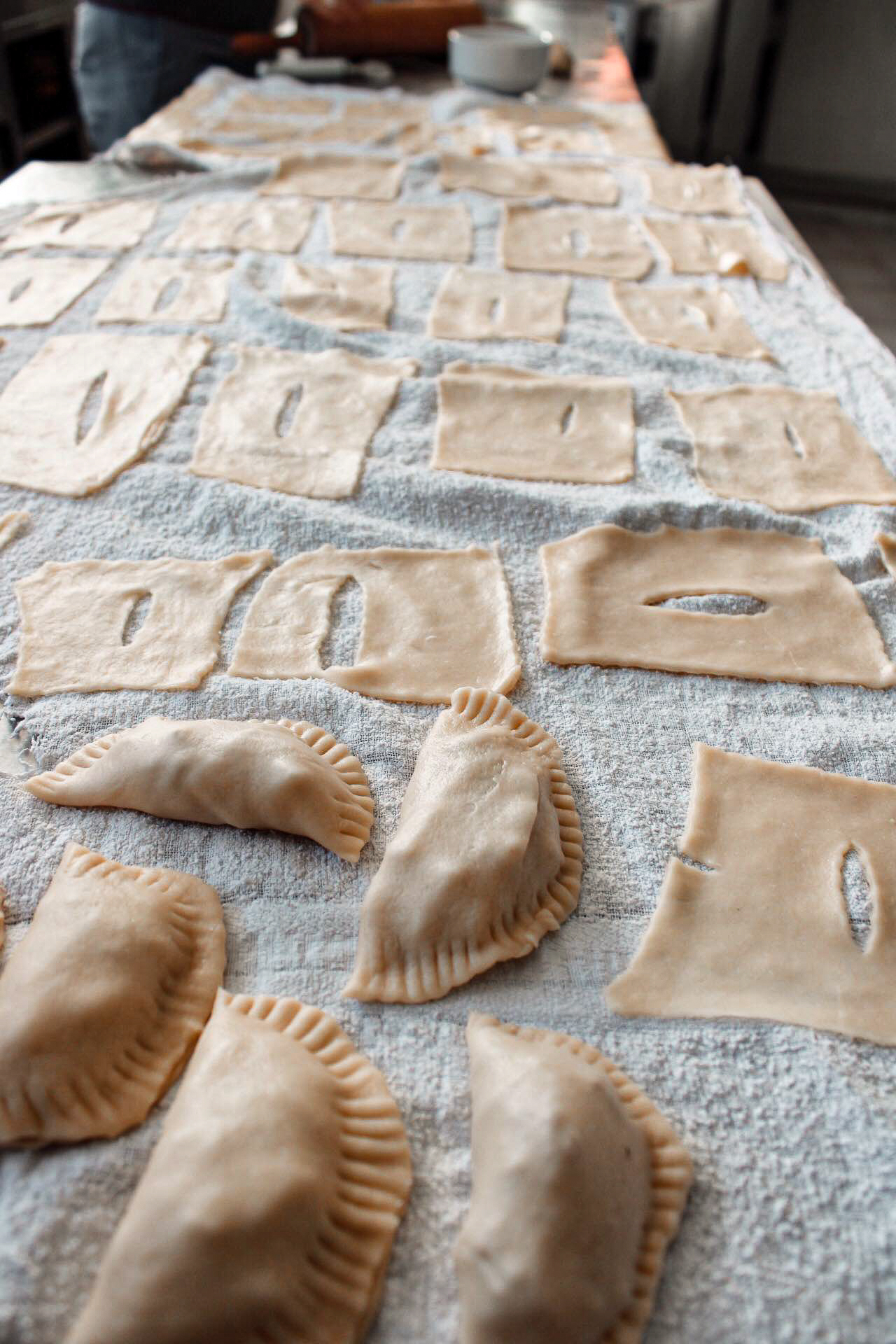You will need enough working space to stretch out the dough in a very thin layer. Spread flour on the table so the dough does not stick and start rolling it out (or use your pasta machine) to thin sheets. Cut the dough with a knife into rectangular pieces approximately 12cm by 8 cm with a cut in the middle