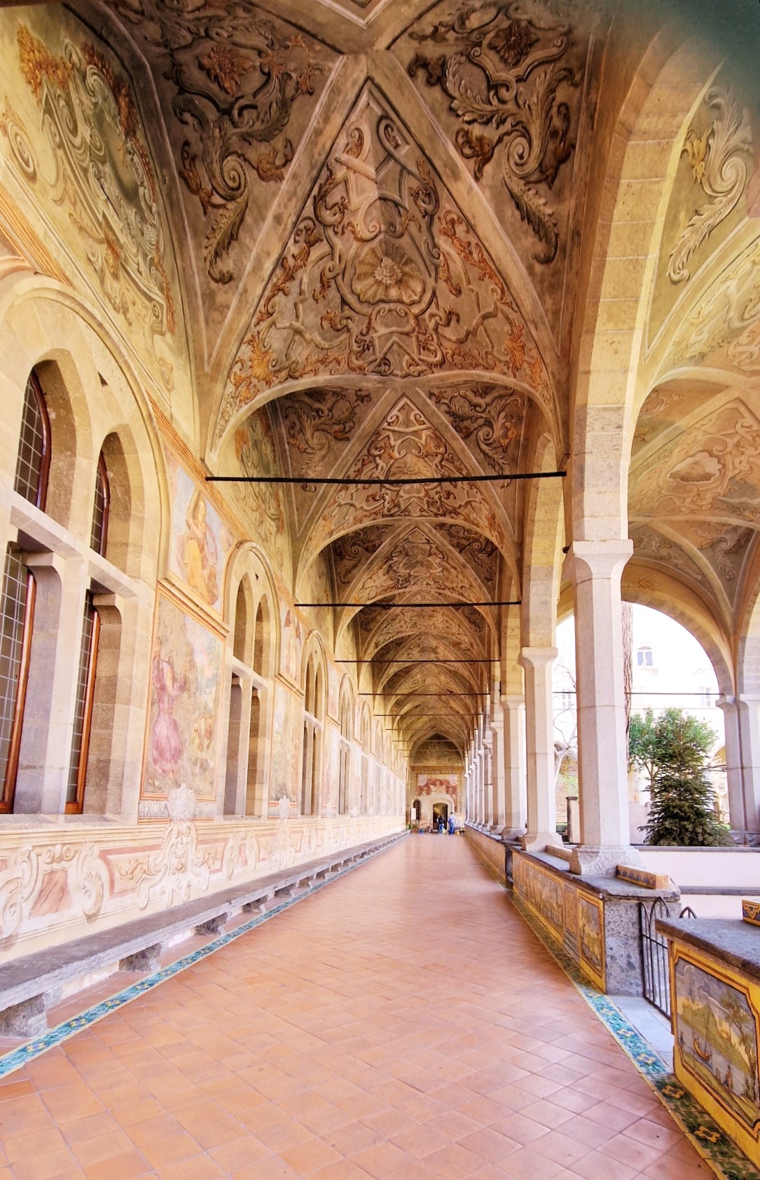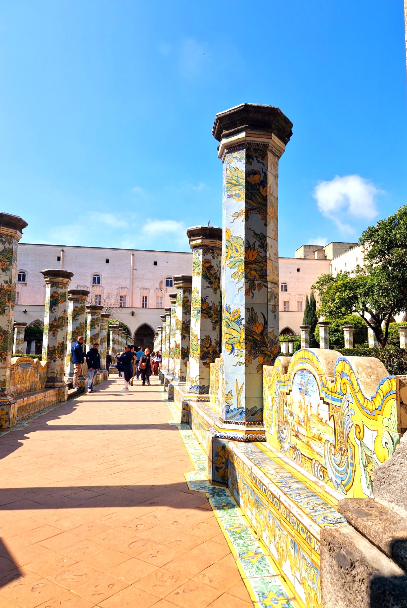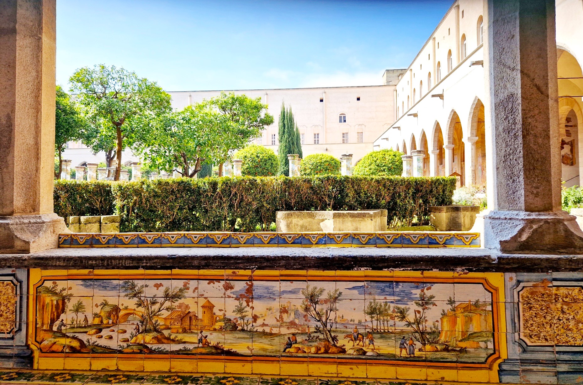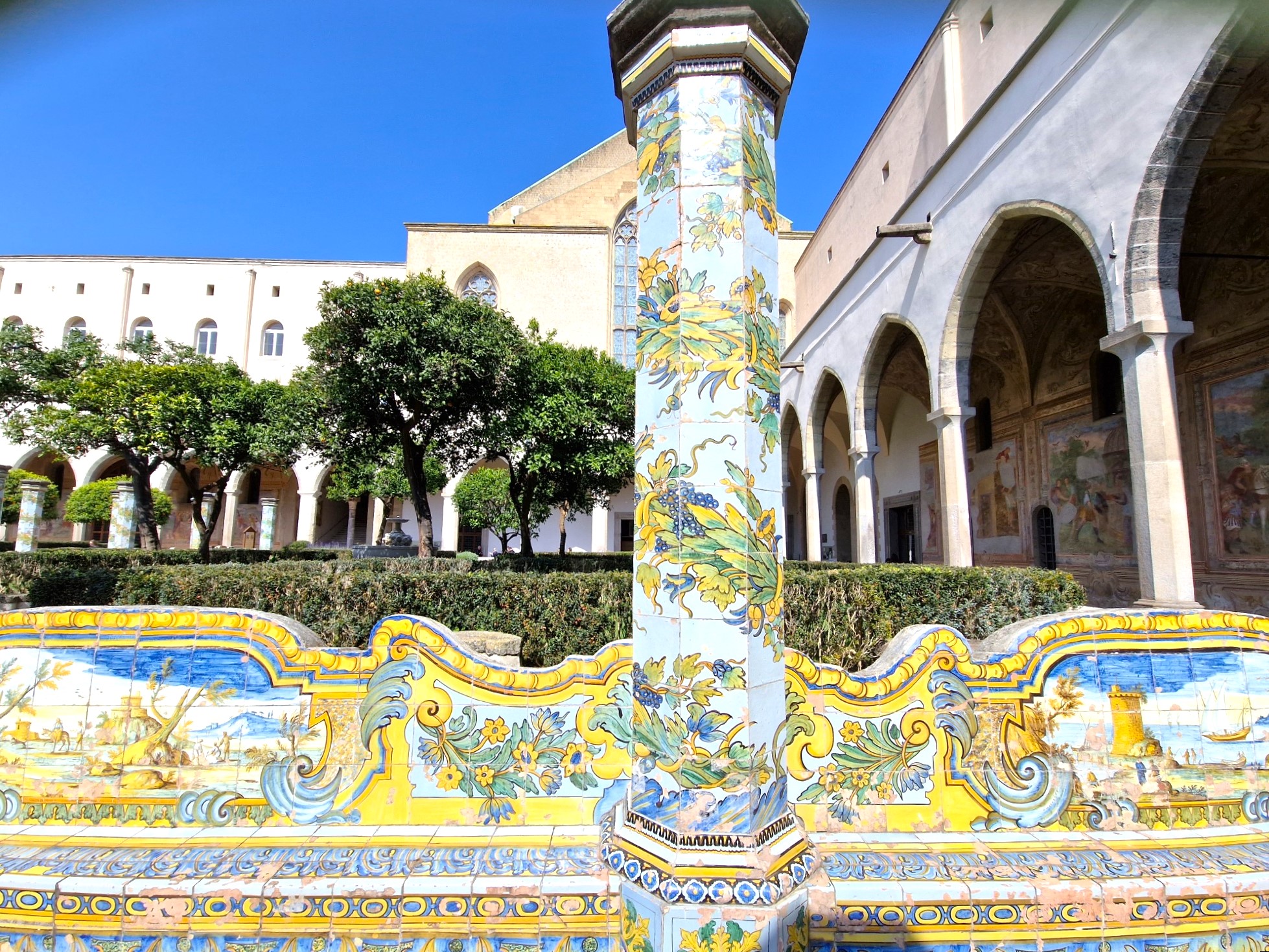 Niet ver van de Capella Sansevero vind je het tweede item van mijn bucket list , het Chiostro di Santa Chiara. Dit monumentale complex in het hartje van het historische centrum werd al in 1310 gebouwd. Voornamelijk de kloostertuin met zijn betegelde banken en zuilen en de fresco´s onder de galerij zijn prachtig. Het is een kleine oase met sinaasappel- en citroenbomen midden in de stad.