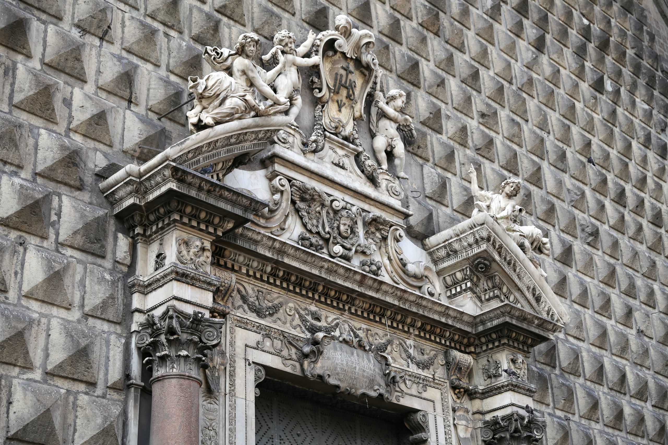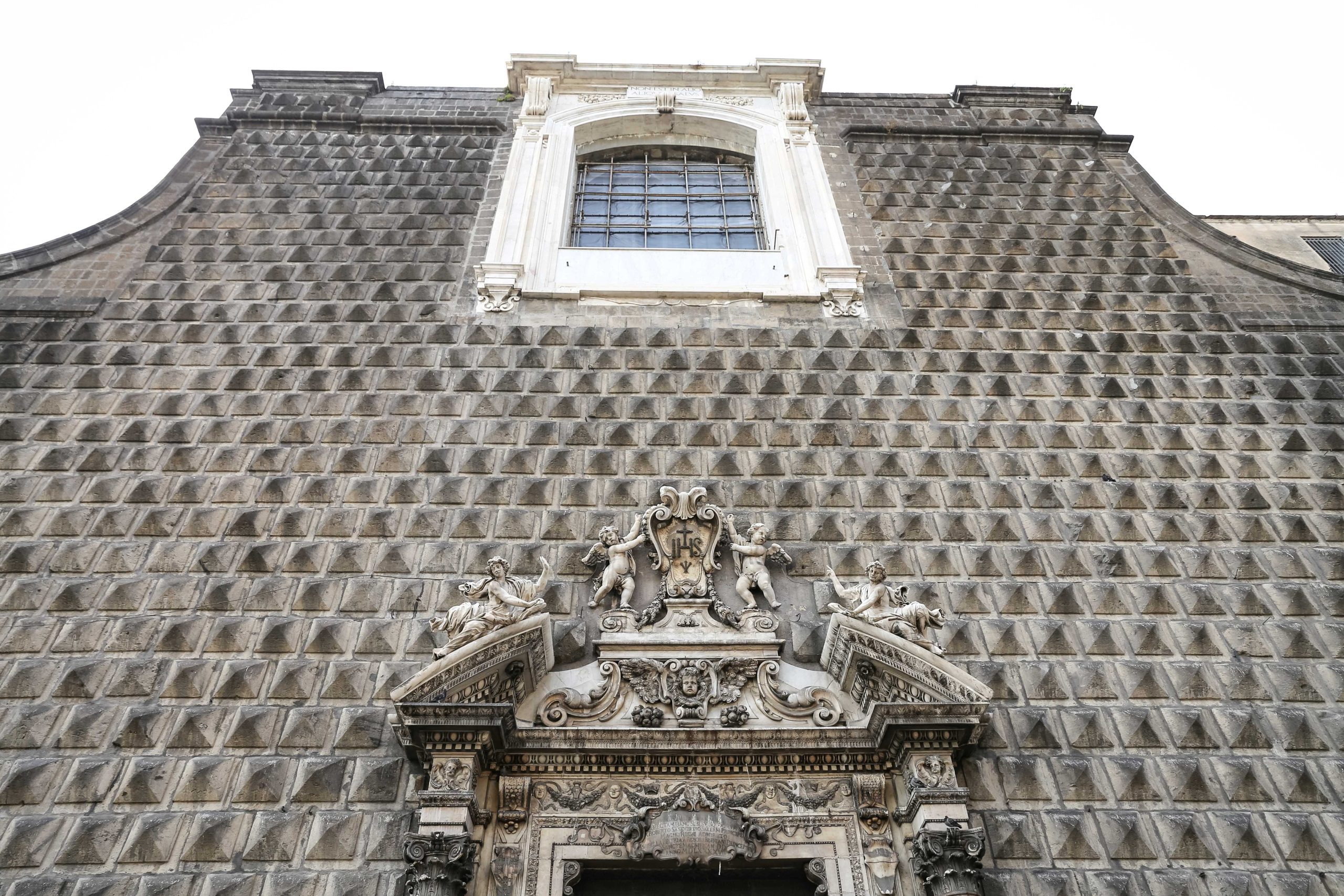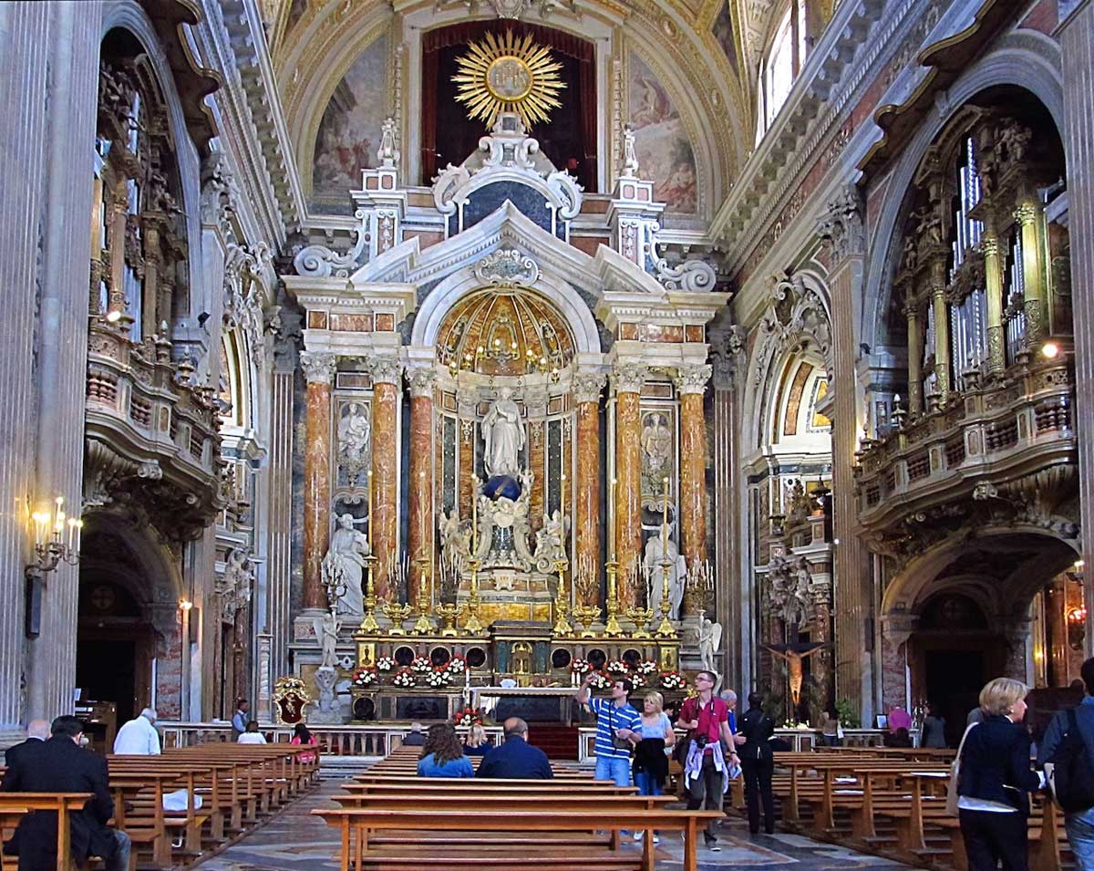 Tegenover de ingang van het Chiostro vind je de “Chiesa (kerk) de Gesù Nuovo met zijn wel zeer bijzondere gevel van grijze Piperno stenen. Deze gevel is naar mijn bescheiden mening bijzonder, maar niet bijzonder mooi. Het interieur is daarentegen prachtig en het is zeker de moeite waard om even binnen te kijken, de entree is gratis.