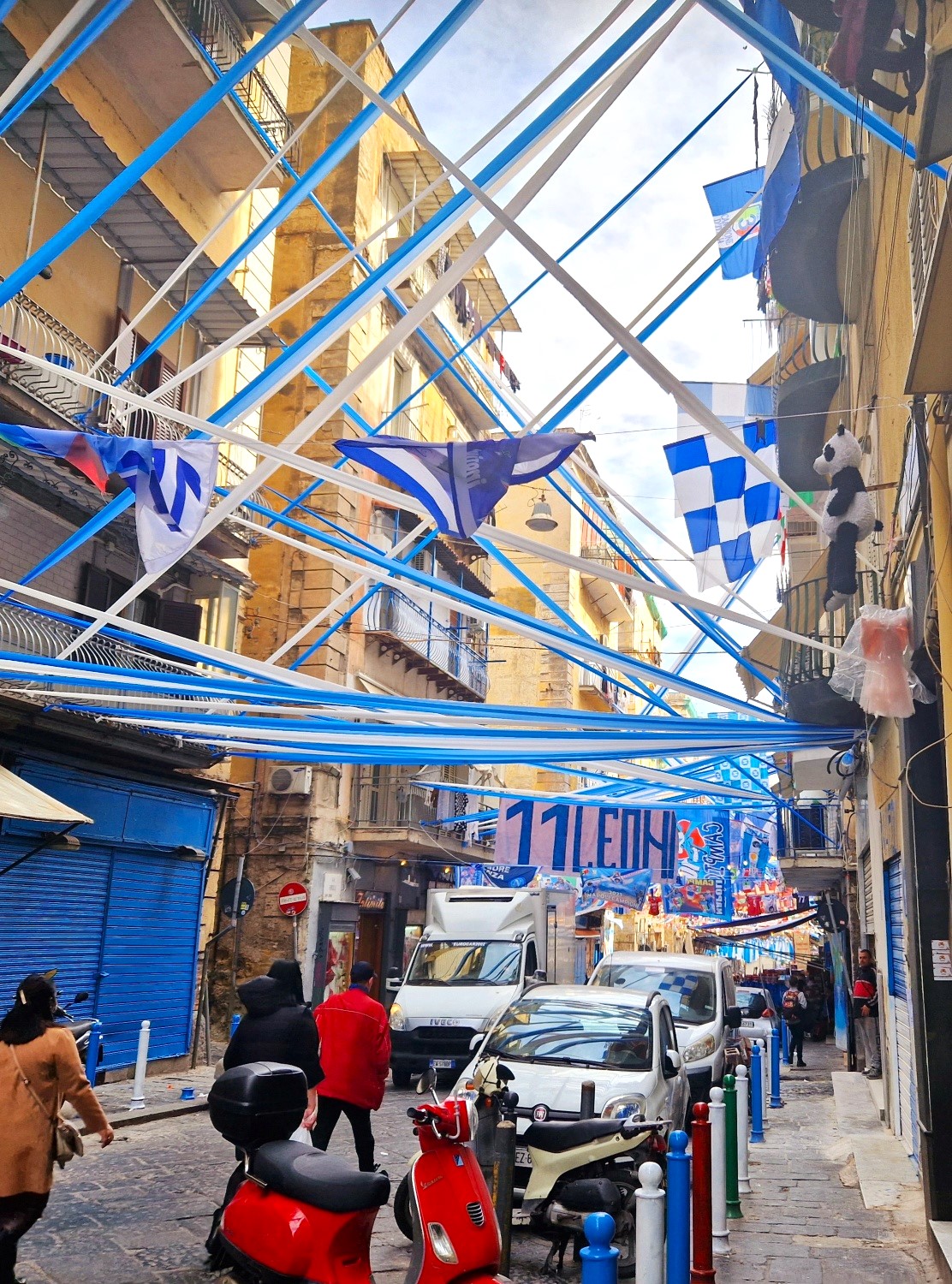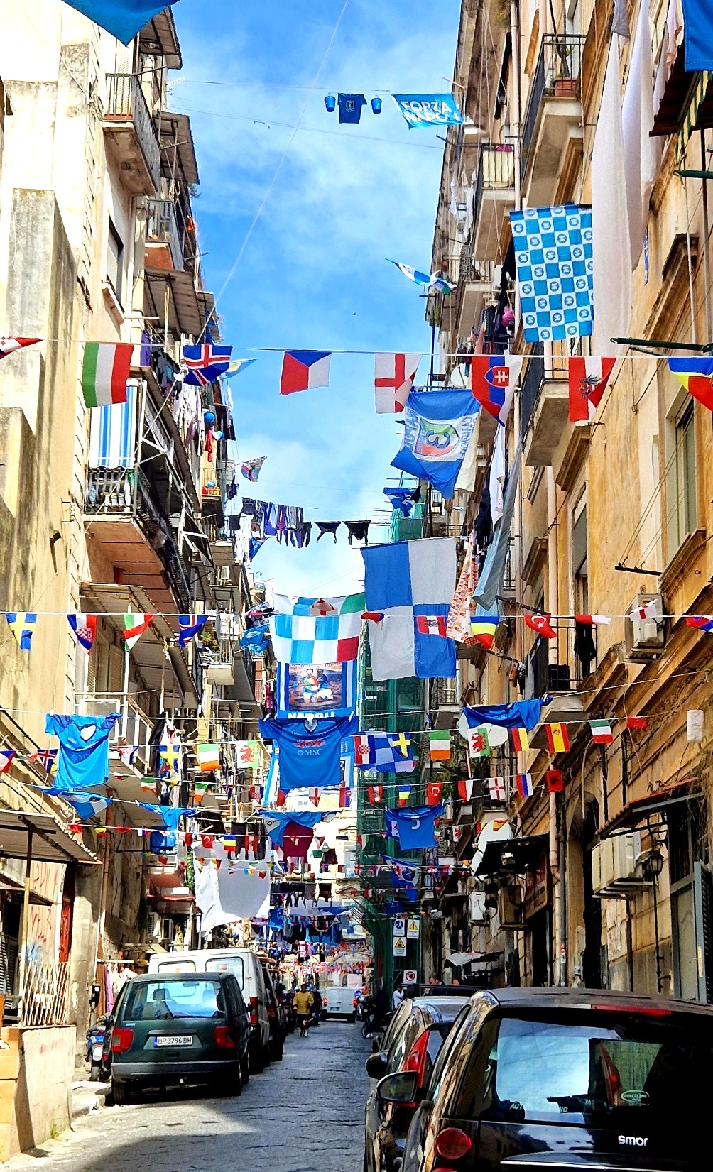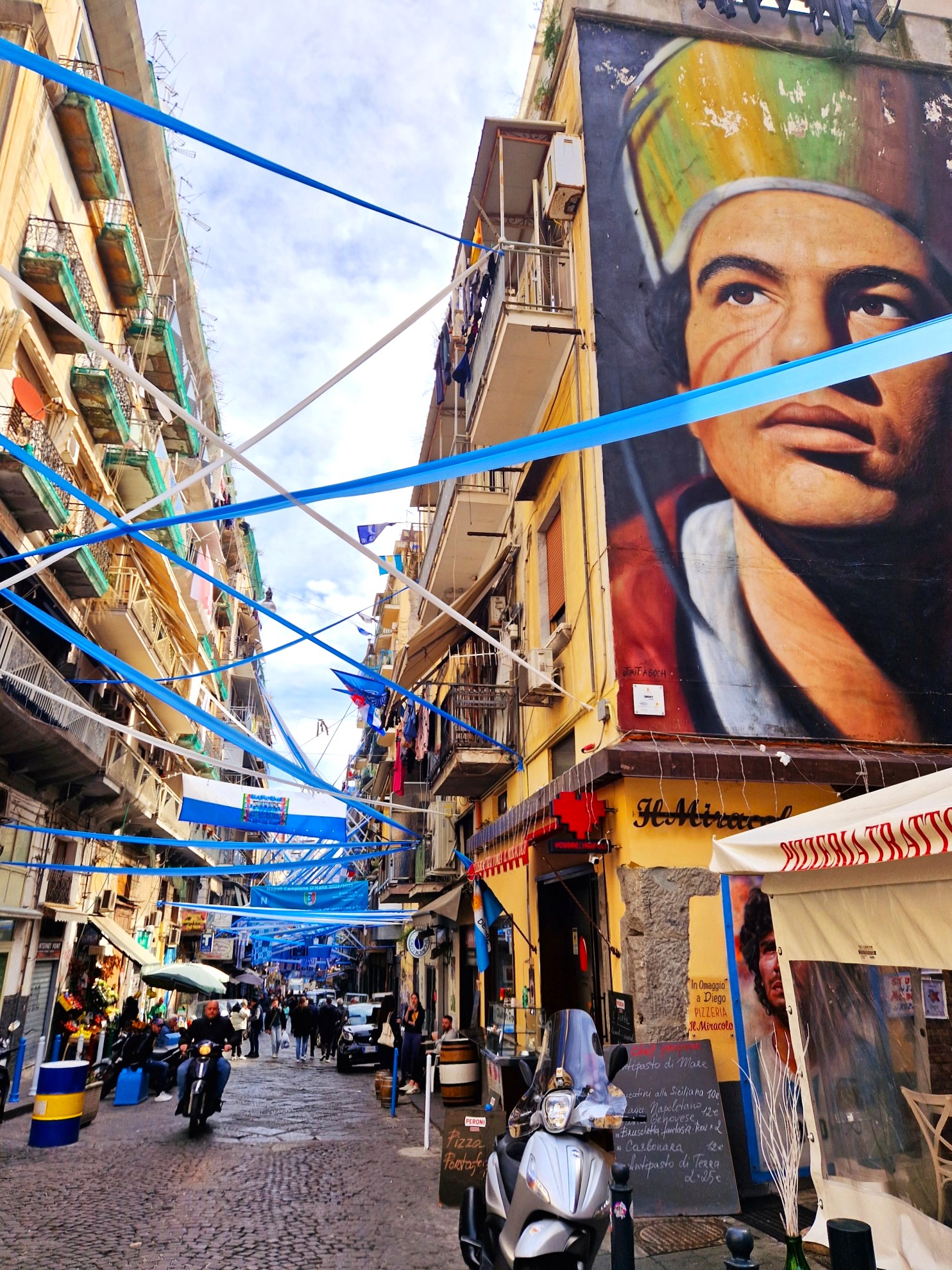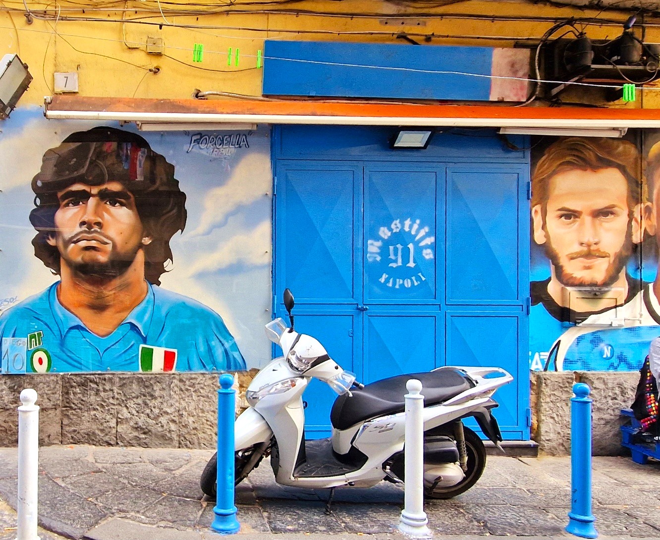 Iedereen weet denk ik wel dat voor de Italianen voetbal een héél belangrijk spelletje is maar in Napoli zijn ze nog net een stukje fanatieker. De hele stad kleurt blauw/wit en in iedere wijk vind je wel muurschilderingen van voetballers. De meest afgebeelde voetballer is natuurlijk Diego Armando Maradona. Met name in de wijk “ Quartieri Spagnoli” zie je veel schilderingen van de man met nummer 10, die voor veel Napolitanen de grootste held van de stad was. Heel eerlijk gezegd was ik wel een beetje verbaasd dat de hele stad al blauw/wit kleurt om het gewonnen kampioenschap te vieren, terwijl die beslissing pas over 3 weken valt 😊. Dat noem ik nou nog eens een positieve instelling!