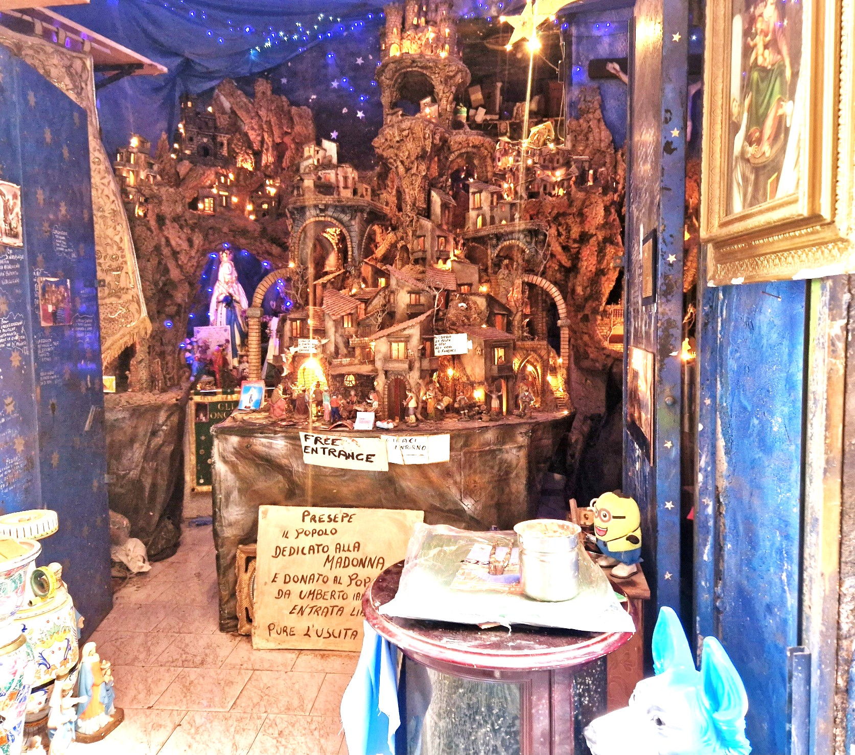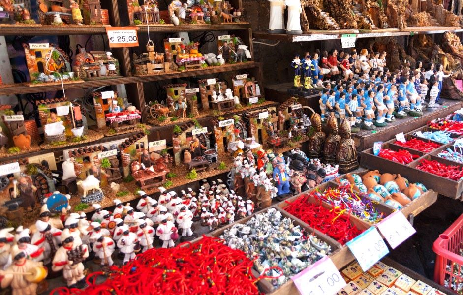We lopen terug in de richting van de straat “San Gregorio Armeno” waar het, het hele jaar kerst is. In deze straat worden allerlei figuren voor de kerststal verkocht en dan niet alleen de traditionele heilige figuren maar vooral ook bekende Napolitaanse figuren, voetballers, pizzabakkers, dieren enzovoorts. Deze straat is een belevenis op zich met al zijn grote kerststallen en alle bijbehorende figuren. Voor de mooiste figuren kun je het beste naar de winkel op nummer 18 gaan.