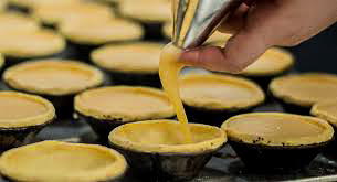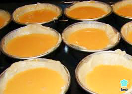Take the muffin pastry moulds out of the fridge and pour the custard into the pastry moulds. Place the Pastéis de nata in the oven and bake for 12 to 15 minutes until the top is nicely browned.